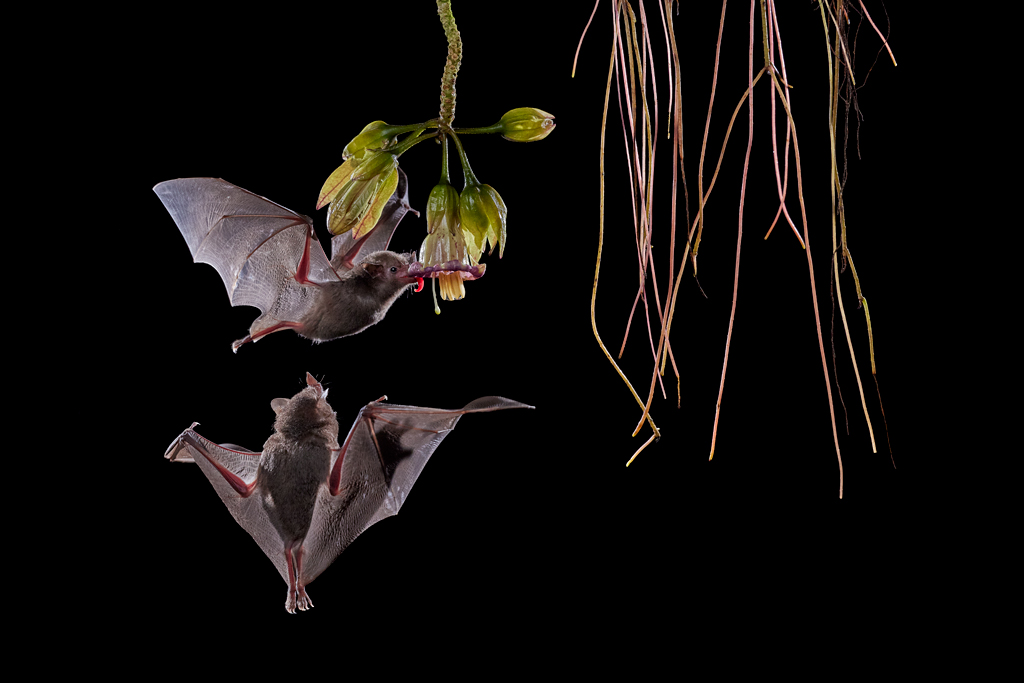 To capture nectar loving bats feeding at night is a real photographic challenge. But being close to a pristine forest and illuminating the darkness helped me to be able to snap this exceptional night shot that reveals the scarlet tongue of a bat as it feeds. The rainforest is home to Merinthopodium neuranthum, a member of the Solanaceae plant family. The flowers hang from branches and are pollinated by bats. Each flower opens for just one single night, though not all at the same time, so I had to learn to identify a bud that was poised to bloom that evening in order to set up around it. I used a technique known as high-speed photography to freeze the moment, capturing the rapid wing beats and unfurling tongues of the bats. It took thousands of images over five consecutive nights, each time with a different flower, to get just this one. Nectarivorous bats use vision, smell and echolocation to find their food sources. While feeding they inadvertently act as pollinators, providing this essential service to hundreds of plant species worldwide.