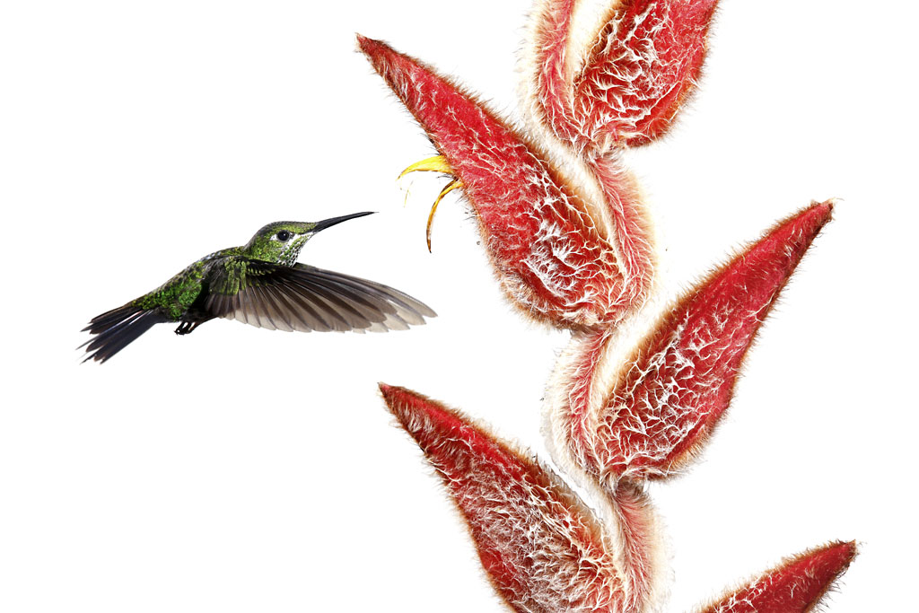 In order to capture this image I spent three days deep in the Costa Rican highlands rain forest. I found an Heliconia vellerigera also known as 'Heliconia King-Kong' and I set up a white background. My goal was to enhance the clean lines of this Green-Crowned Brilliant Hummingbird, Heliodoxa jacula, and the incredible texture of the plant waiting the bird came to suck the nectar. With the help of six strobes and a wireless shutter release and after over thousand frames I managed to get the bird in the right position just before reaching the flower.