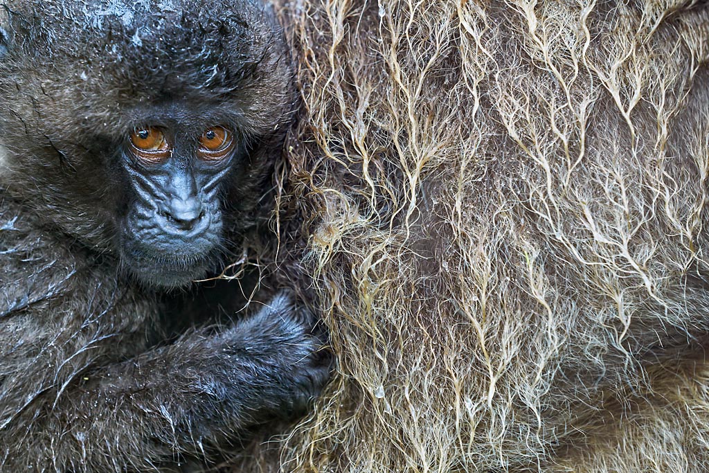 Isolated in the remote Ethiopian Highlands the Gelada Baboons live along the ridge of sculpted cliffs at “The Roof of Africa”. During a storm and far from their shelter, a small group of females and babies gathered tightly together to protect themselves from the rain. I managed to gain their confidence to the point where they let me enter the group. I was fascinated by the way this infant stared at me. The mixture of interest and shyness of its gaze, provoked in me a pleasant sense of human warmth.