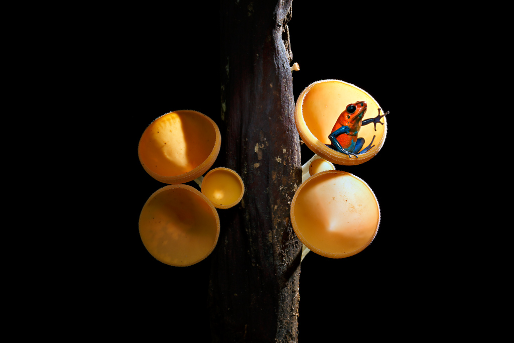 Frogs are one of the most amazing groups of animals in Nature and they are even considered lucky or fertility symbols. Costa Rica is a frog paradise and I usually try to take some photos of these amphibians when I visit its National Parks. This tiny blue jeans frog, Oophaga pumilio, particularly shows an extreme variation in colour and pattern between populations and this individual caught my eye because of the blue colour of its arms and legs. I was especially fortunate with this particular specimen as it was a very photogenic actor: its body language was perfect and it displayed all its skills posing for the camera. I myself tried to do my best by darkening the shadows and emphasizing the subject with a spot-light.