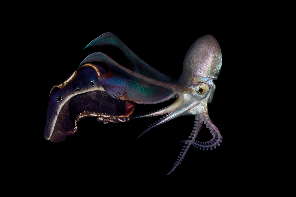 A female blanket octopus emerges from the dark and flashes open her shimmering cape. These striking cephalopods spend their lives in the open ocean and, though widely distributed, are rarely seen and little known. After many hours diving at night in deep water in Balayan Bay in the Philippines, I was thrilled to meet this one. It was new moon, the best time for blackwater diving, when animals are more likely to be attracted to dive lights. Spreading her arms to reveal the iridescent sheets of webbing makes her seem larger and more intimidating. She may even carry jellyfish stinging tentacles as defence. And for a quick getaway, she folds in her arms and jets away, her cape flowing behind her. The difference between the sexes is startling. With her cape, a female can reach 2 metres (6.5 feet). The tiny male has a mantle of 2 centimetres (0.8 inches) and sports no cape at all.