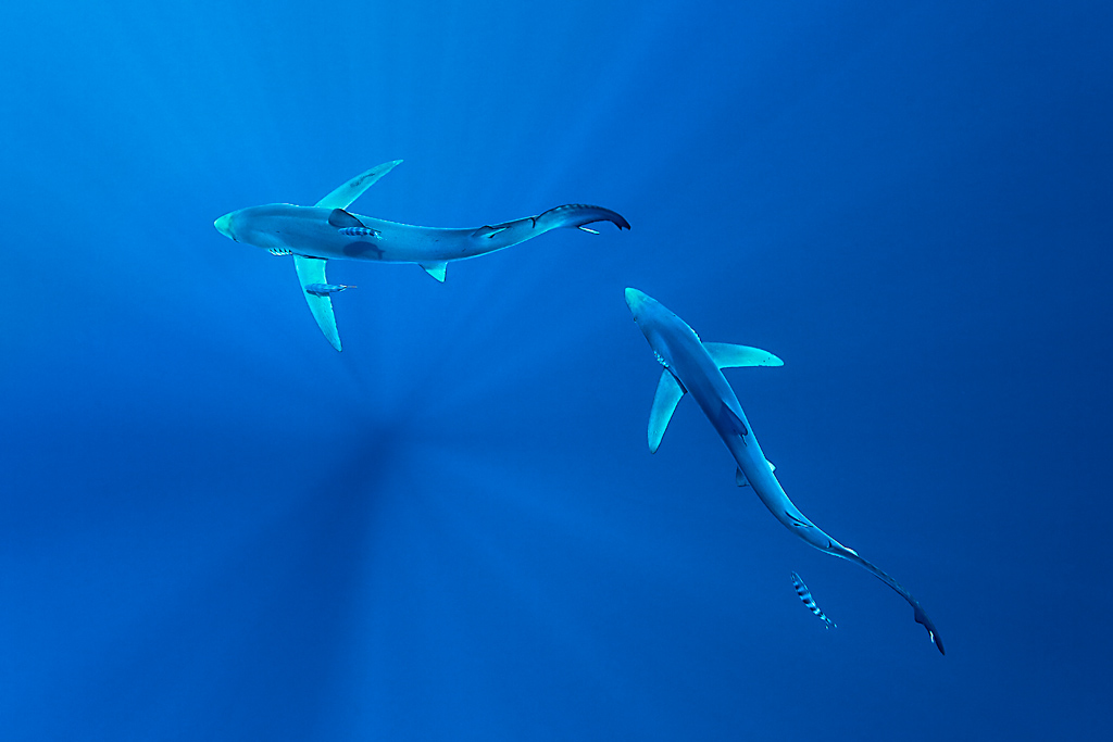For me, photographing blue sharks was a dream come true. It involved a special trip to Faial Island in the Azores, and then a two-week wait for a sunny day with water clear enough to photograph the sharks. The location was several kilometres off the coast, as it was where shark-migration researchers had submerged a container of bait, but it was still a photographic gamble. Blue sharks travel vast distances – commonly up to 3,000km (1,700 miles) – utilizing major current systems, such as the Gulf Stream, to undertake their clockwise transatlantic migrations. They are also the most heavily fished sharks, with an unsustainable annual catch estimated at 20 million (mostly as longline and driftnet fishery bycatch), their fins being sold to the Asian market. I especially wanted a view looking down on them, to illustrate the beautiful, sinuous movement that characterizes their elegant swimming style. The water clarity was perfect, but I had no point of reference, and while waiting for sharks to pass beneath him, it was a struggle to maintain his position and depth against the strong currents. Finally, two blues swam gracefully past, pilot fish in attendance, just 8 metres (26 feet) below, presenting him with the composition I had been waiting for.